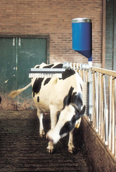 Gracias al depósito que lleva incorporado el sistema, al frotar la vaca su piel contra los cepillos, éstos depositan en el lomo una cantidad de producto insecticida.